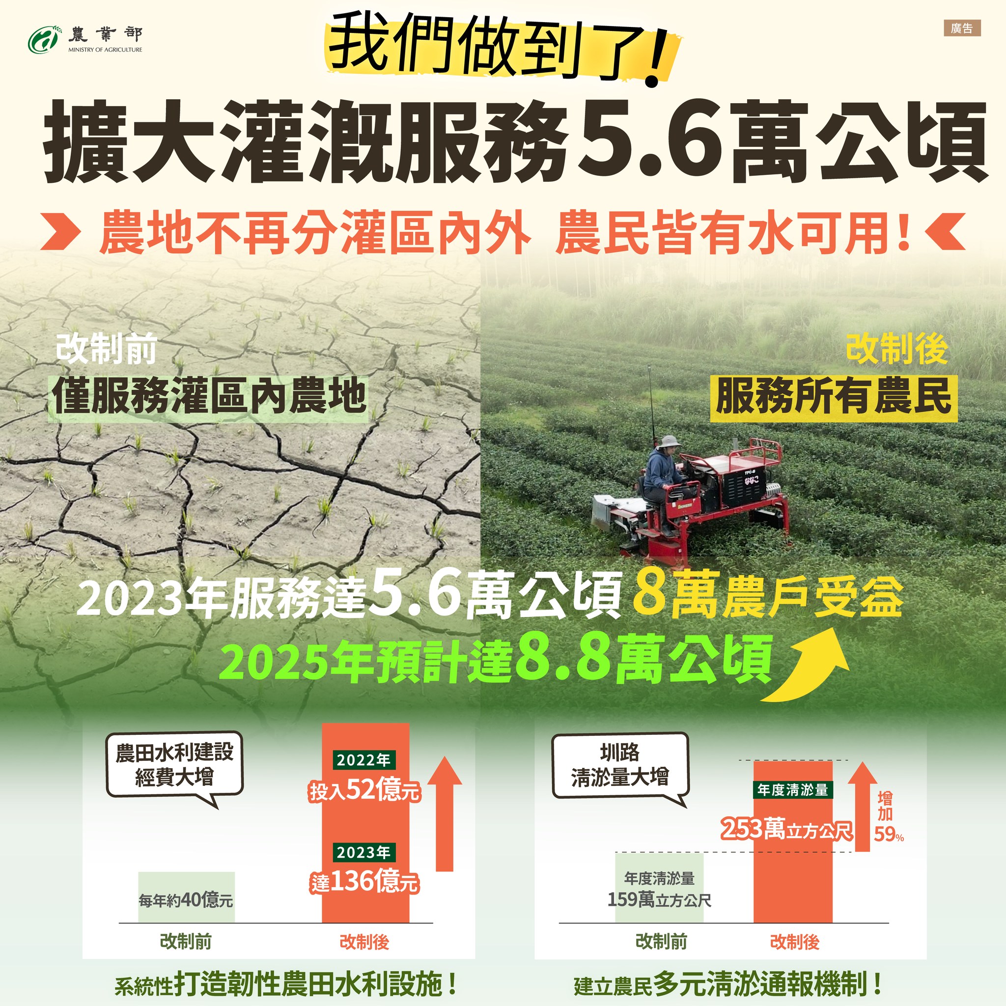 2020年農田水利會升格為公務機關,擴大灌溉服務5.6萬公頃,