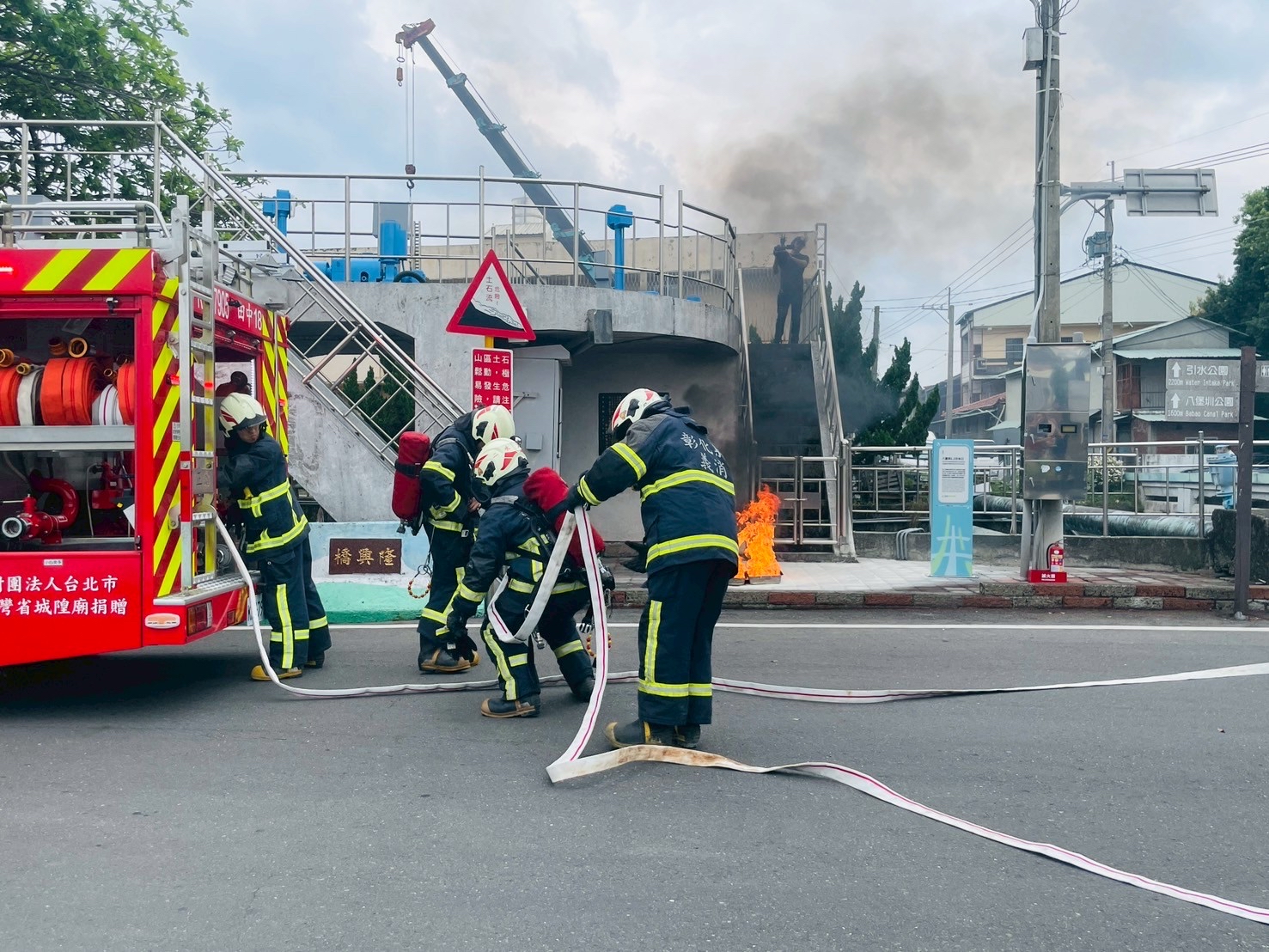 農水署表示,本次防災演練設計複合型災害疊加情境,並以人員實際推演方式進行。第一情境為巡檢期間發生民眾不慎落水事件,巡檢人員第一時間投擲救生圈,並通報消防單位到場救援,迅速完成現場處置。第二情境模擬地震導致機電控制箱起火,閘門受損無法啟閉,需透過消防單位協助滅火後,調派重機械進場排除障礙,確保導水安全。第三情境則為颱風期間連日豪雨,上游集水區進水量暴增,導致八堡圳臨時導水路水位高漲,有致災風險。演練中由農水署彰化管理處用水管制中心即時通報經濟部水利署集集攔河堰管理中心調節水量,有效降低下游淹水風險。第四情境則模擬紅色土石流警戒發布後,土砂自土石流潛勢溪流下移造成八堡圳渠道淤積,透過與地方公所及農村水保署合作,派遣重機械進行緊急清疏搶通,成功化解渠道阻塞危機。