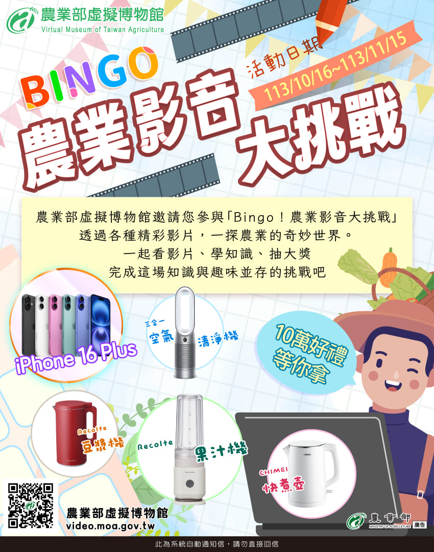 活動說明 農業部虛擬博物館收錄數千部影音資源,邀請您參與「Bingo!農業影音大挑戰」,透過不同影片認識各類農業主題。即刻起,看影片、玩遊戲,把iPhone 16 Plus帶回家! 相關連結 農業部虛擬博物館 相關照片 網站使用鍵盤操作相簿說明: 向左鍵:上一張照片 向右鍵:下一張照片 ESC鍵:離開相簿